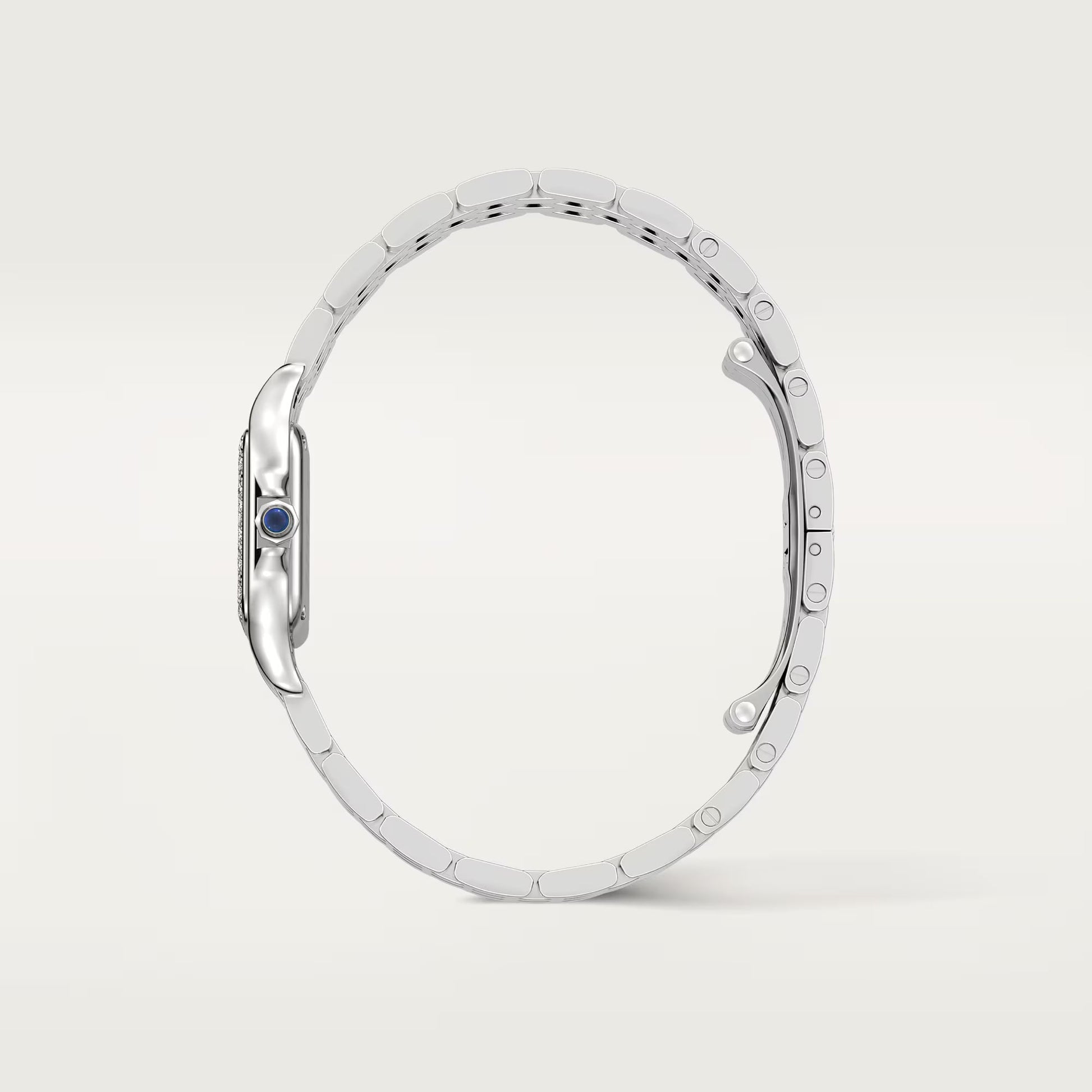 ساعة بانتير دو كارتييه نموذج صغير حركة الكوارتز علبة من الفولاذ إطار مرصع بالألماس المقطوع بشكل لامع الأبعاد: 23 مم × 30 مم السمك: 6 مم تاج مرصع بحجر سبينيل أزرق صناعي ميناء فضي أيدي على شكل سيف من الفولاذ الأزرق سوار فولاذي مقاومة للماء حتى 3 بار (حوالي 30 مترًا)