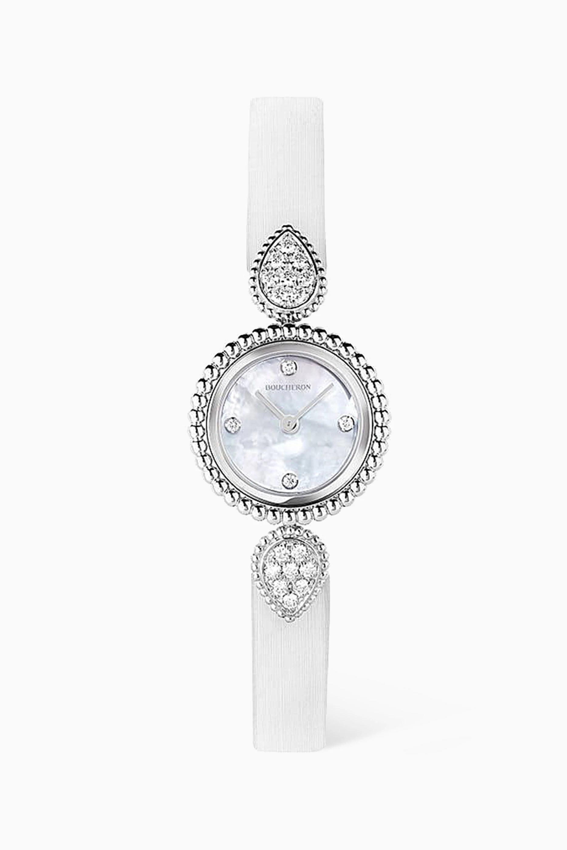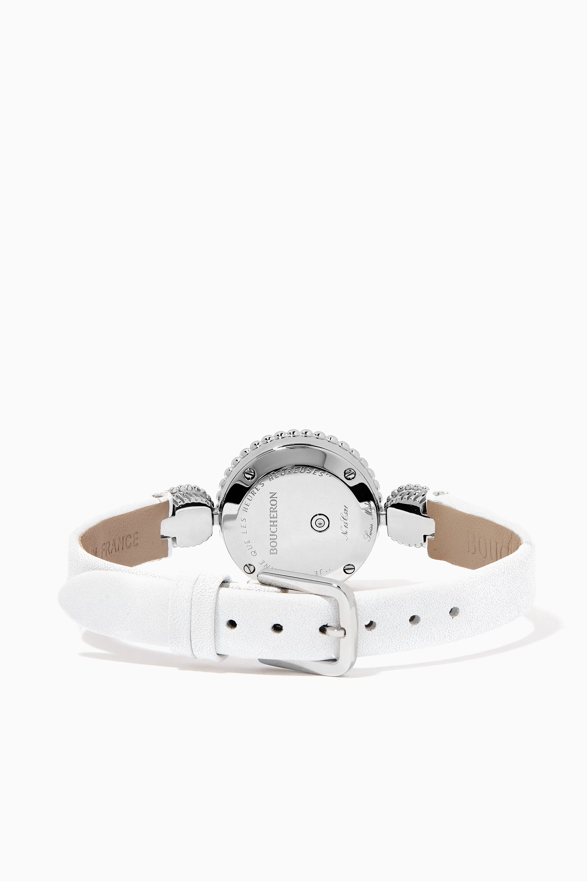 • اللون: أبيض • فولاذ • ألماس • ميناء من عرق اللؤلؤ • حركة كوارتز عالية الدقة • مقاومة للماء حتى عمق 30 مترًا • حزام من جلد العجل • قد يختلف وزن قيراط الحجر/الذهب قليلاً حسب الحجم/النمط • يأتي في عبوة واقية مصممة • صنع في فرنسا