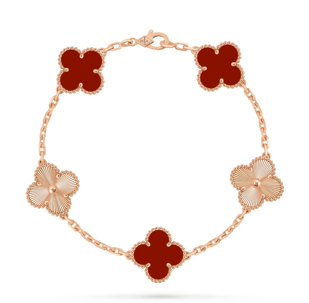 Vintage Alhambra bracelet, 5 motifs, guilloché 18K rose gold, carnelian.