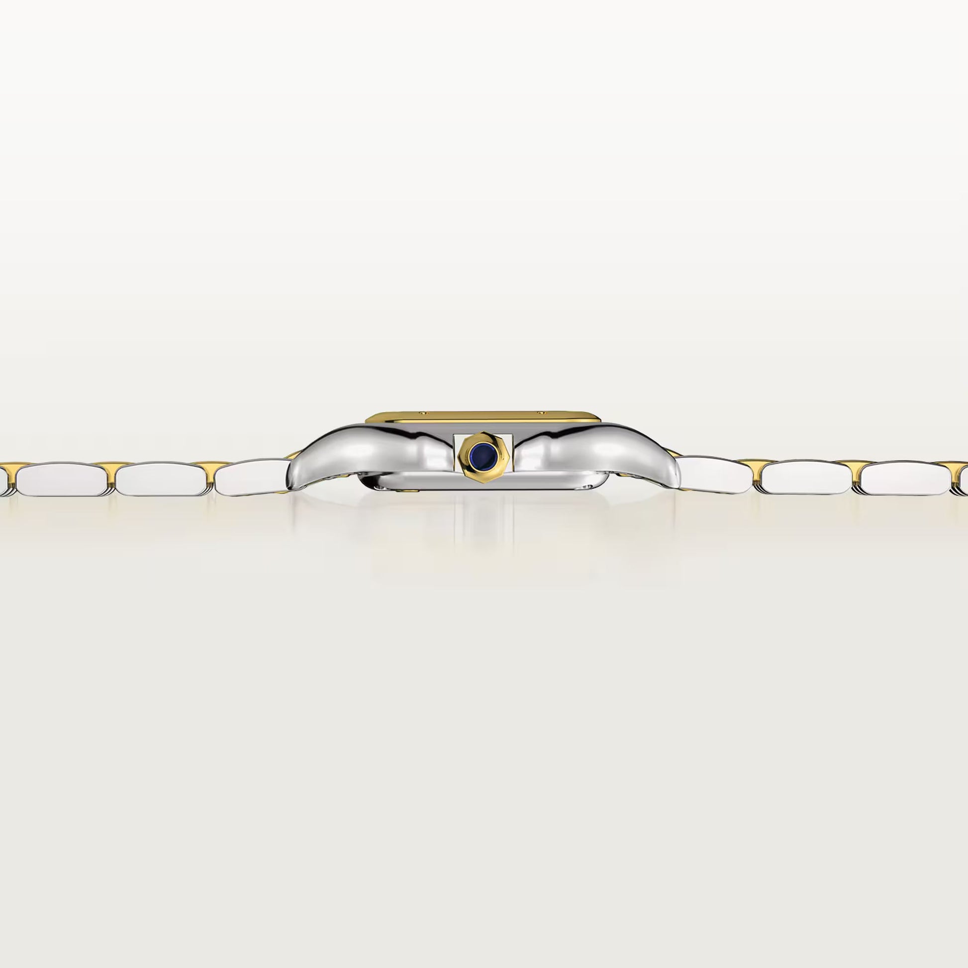 crown set with a synthetic blue spinel, silvered dial, blued-steel sword-shaped hands, bracelet in yellow gold 750/1000 and steel.