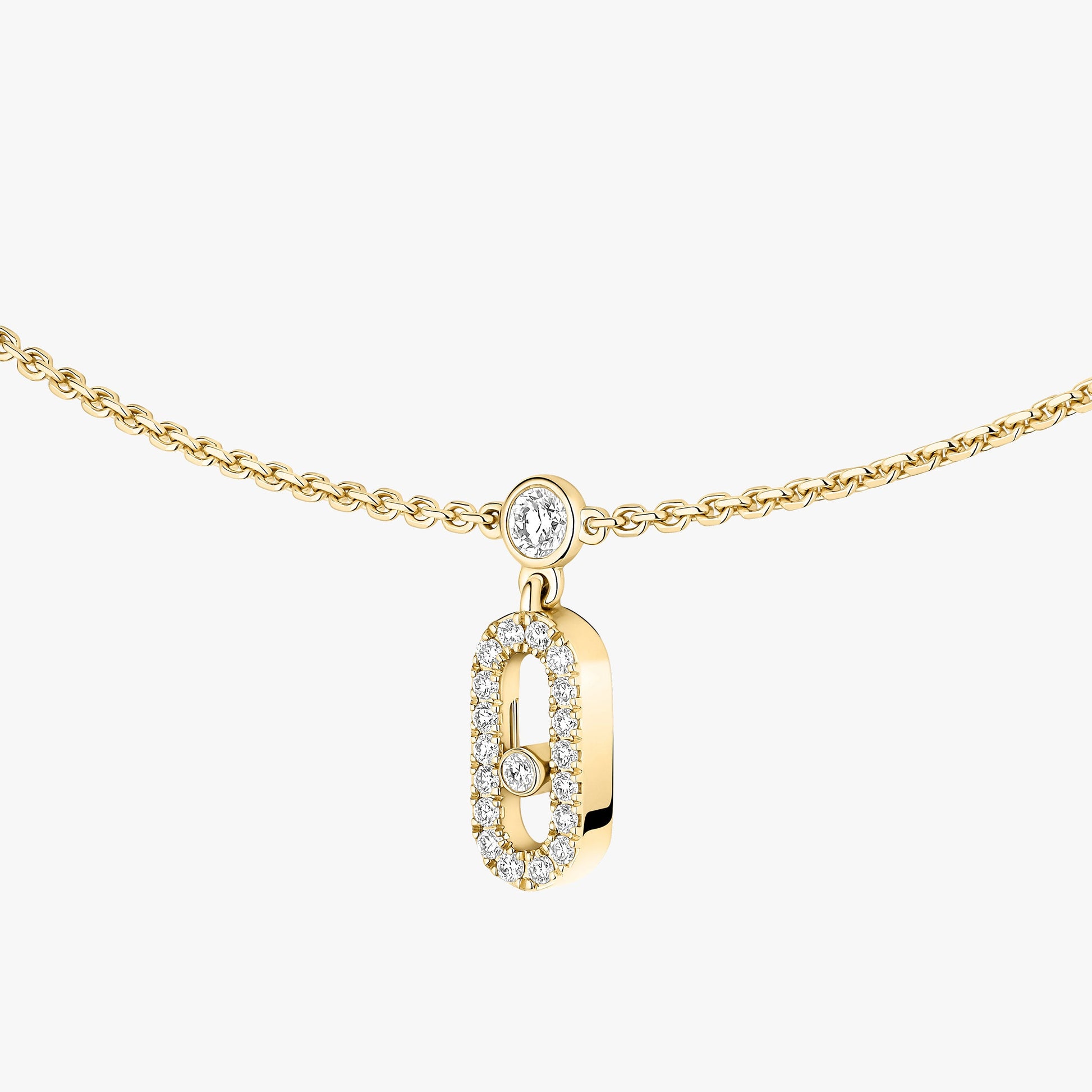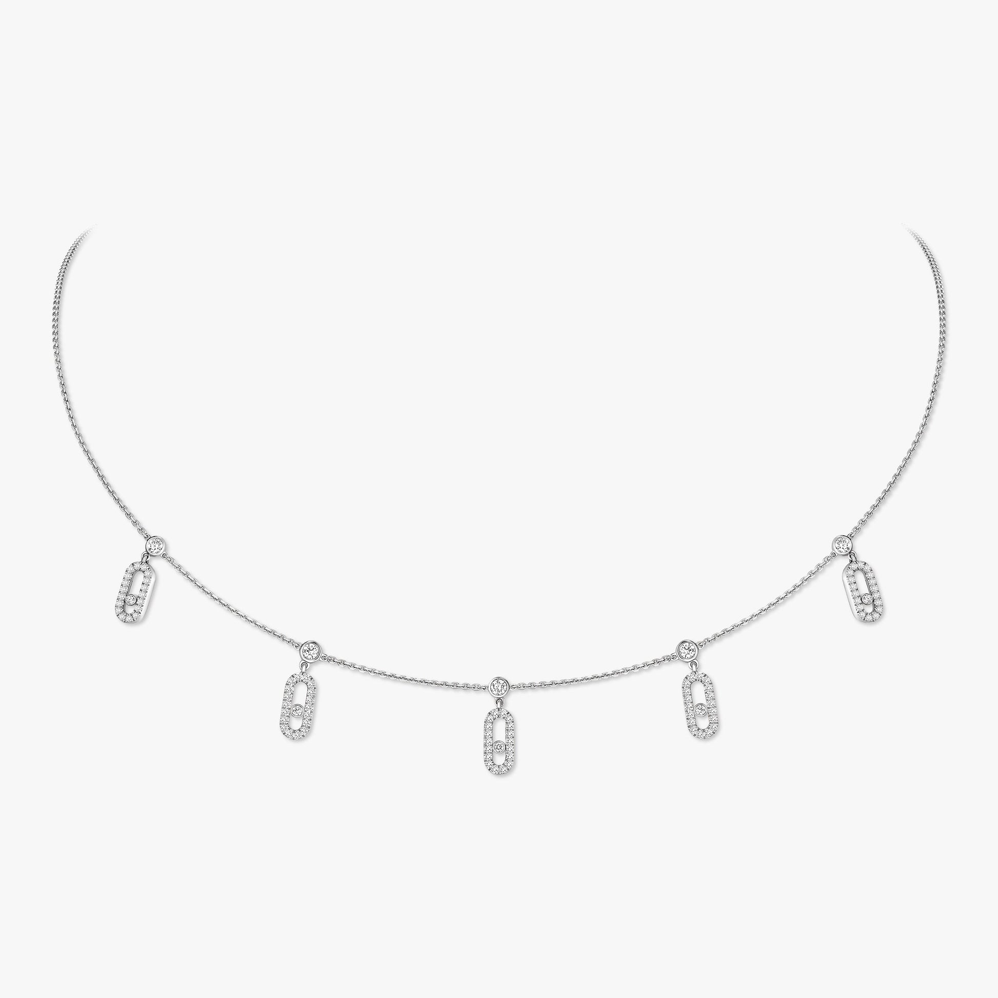 Discover the Move Uno diamond necklace in gold. Its 18-carat gold chain is decorated with 5 Move Uno charms entirely set with sparkling diamonds, which move with the wearer's movements. This women's necklace has a carabiner clasp with a sliding system that will allow you to wear it as a choker. A touch of bohemian chic for an unparalleled glow.