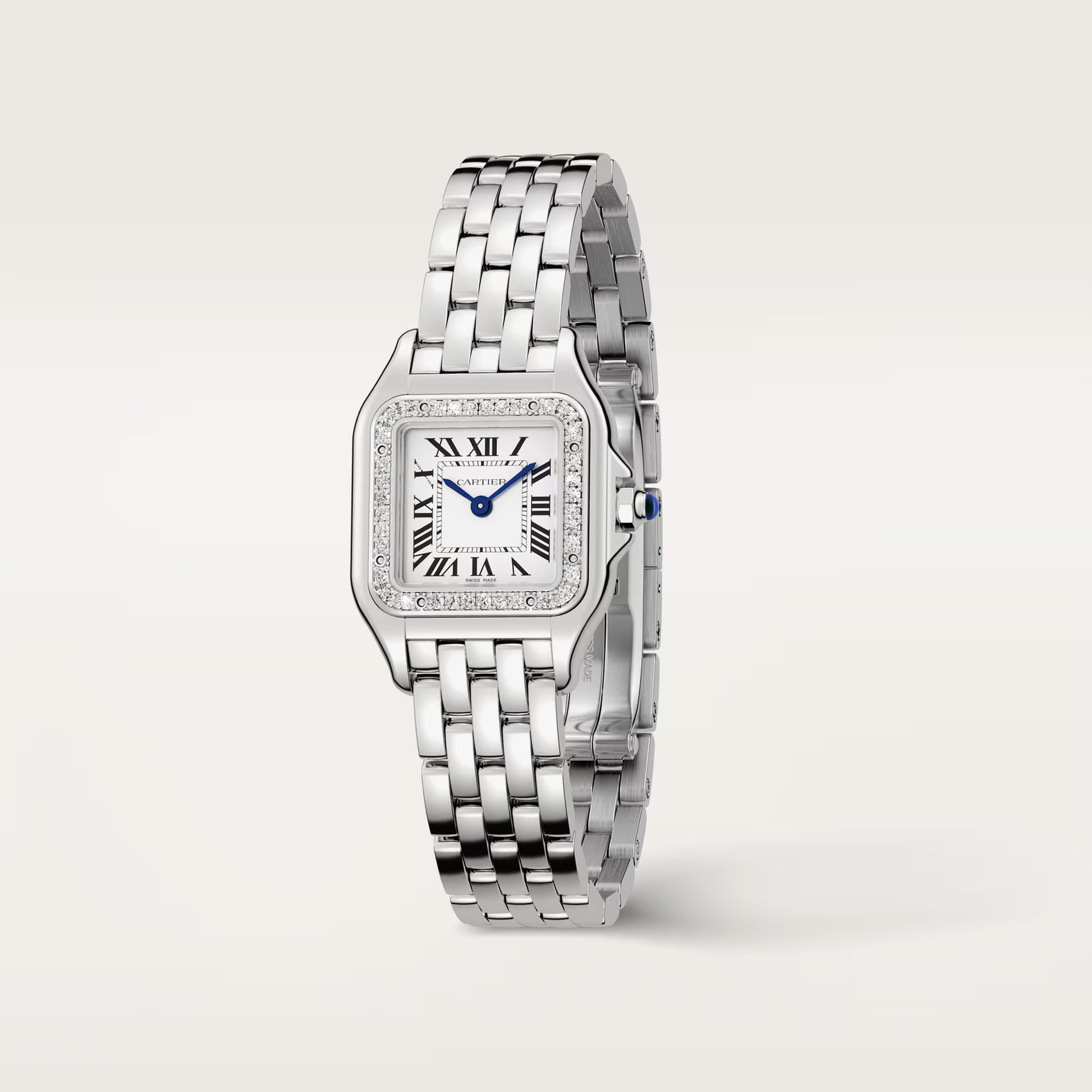 Panthère de Cartier watch Small model Quartz movement Case in steel Bezel set with brilliant-cut diamonds Dimensions: 23 mm x 30 mm Thickness: 6 mm Crown set with a synthetic blue spinel Silvered dial Blued-steel sword-shaped hands Steel bracelet Water-resistant to 3 bar (approx. 30 meters)
